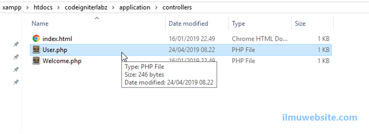 Pertama kita masuk ke dalam application/controller lalu buat file class baru yakni User.php